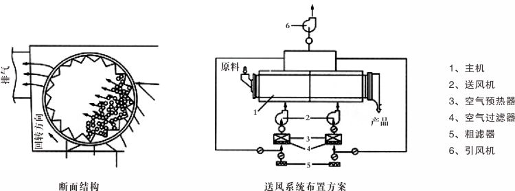物料由進料口進入有一定傾斜度的回轉筒內,借筒體的回轉運動和抄板的上下翻動,一面在床內轉動 ,一面向出料口移動,熱風通過筒壁上的小孔及抄板孔穿過物料上的小層。物料在運動過程中與熱風成90°角充分直接接觸,進行傳熱傳質,達到干燥效果。