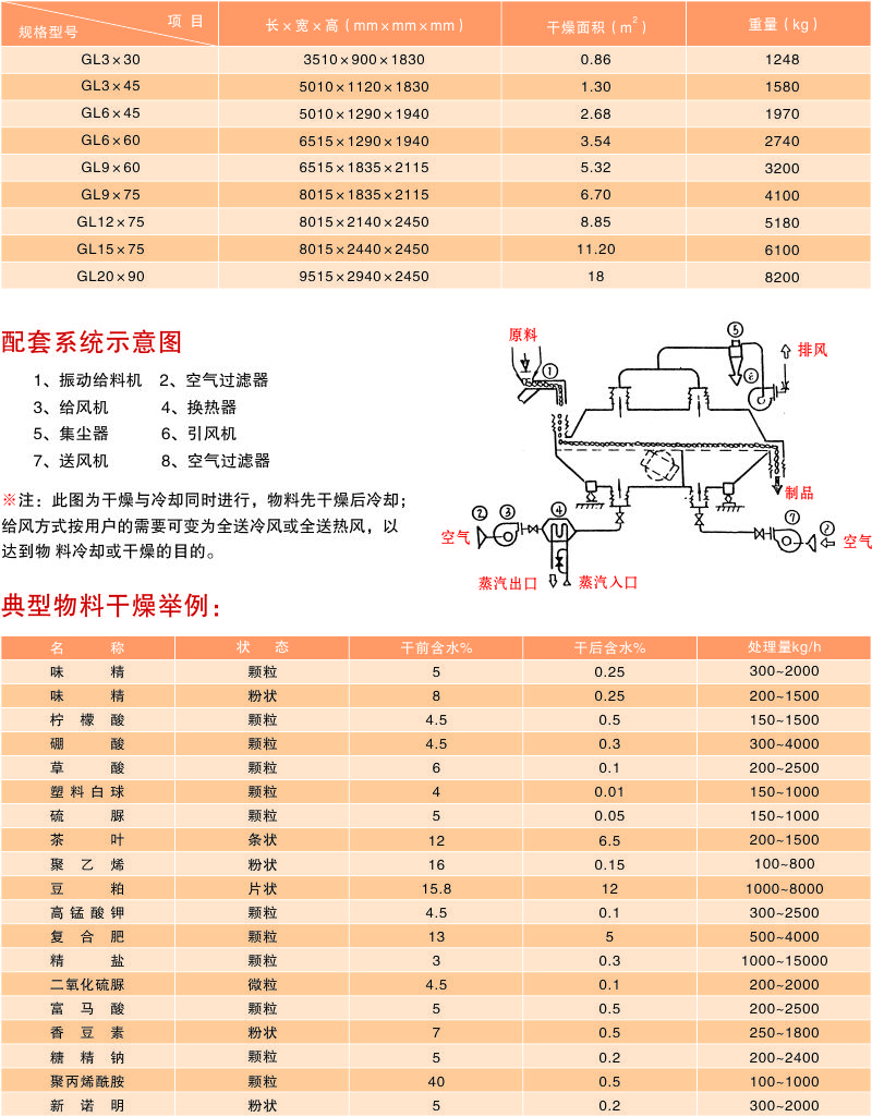 干燥強度:針對不同物料及不同的加熱溫度,干燥強度在30-50kg H2O/hm 之間。